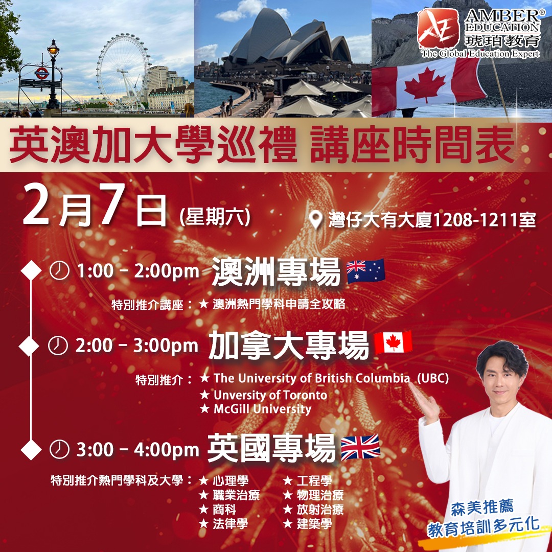 英澳加大學巡禮將提供一站式講座,專為有興趣赴海外留學的學生而設,特別是尚未決定留學目的地的同學。你可以參加各場講座,深入了解不同國家的熱門學科和申請攻略。這些講座將由學校代表或專業教育顧問主持,確保學生能充分掌握當地的學習制度和文化!對於有意前往海外升學的學生,請立即註冊!