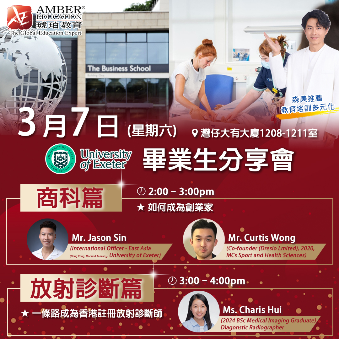 本週的分享會特別邀請到來自University of Exeter的畢業生分享他成為創業家的心路歷程,和詳細講述在過程中所面臨的挑戰與成果。同時,放射診斷畢業生將深入介紹課程資訊與解構成爲執業放射診斷師的過程。此外,畢業生還會對修讀課程進行分析,並探討其職業未來的發展方向,以幫助學生清晰了解各科的職業方向。
