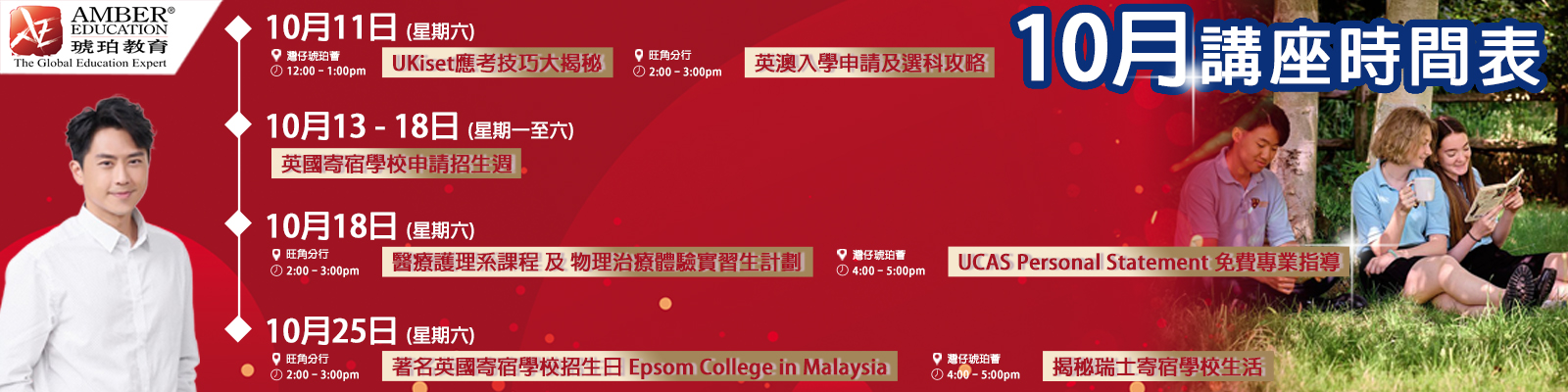 琥珀教育將於2025年10月的每個星期六舉辦一系列精彩的升學講座。本月的講座將聚焦於國際化的教育,内容包括英國、瑞士、澳洲和馬來西亞等地的升學資訊,並分享不同的申請攻略,幫助學生和家長順利獲得心儀學校的入場券!不要錯過這個機會,立即報名,開啟你的升學旅程!